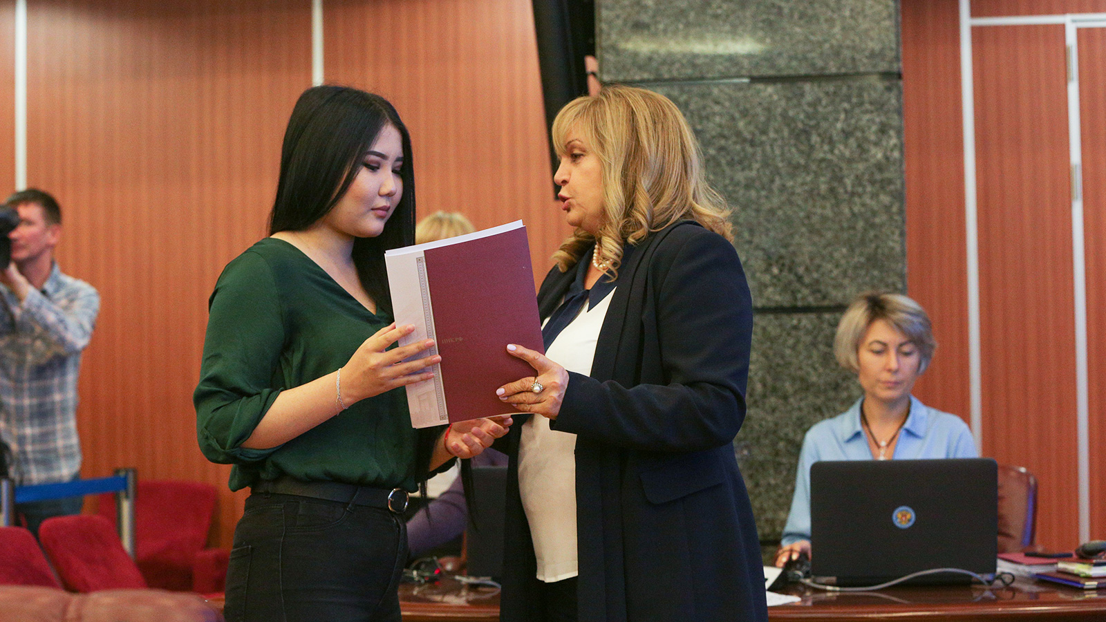 После выступления Николая Левичева Элла Памфилова поблагодарила Айсу Хулаеву за проявленную гражданскую позицию и вручила благодарность ЦИК.